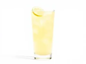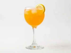 - Pour orange juice into a collins glass over two ice cubes.