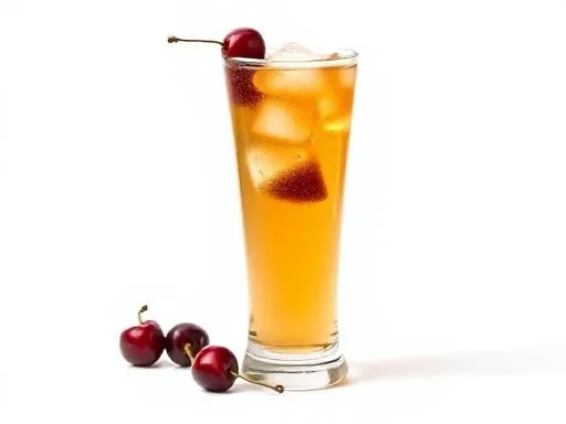 - Pour over ice cubes and add two cherries.